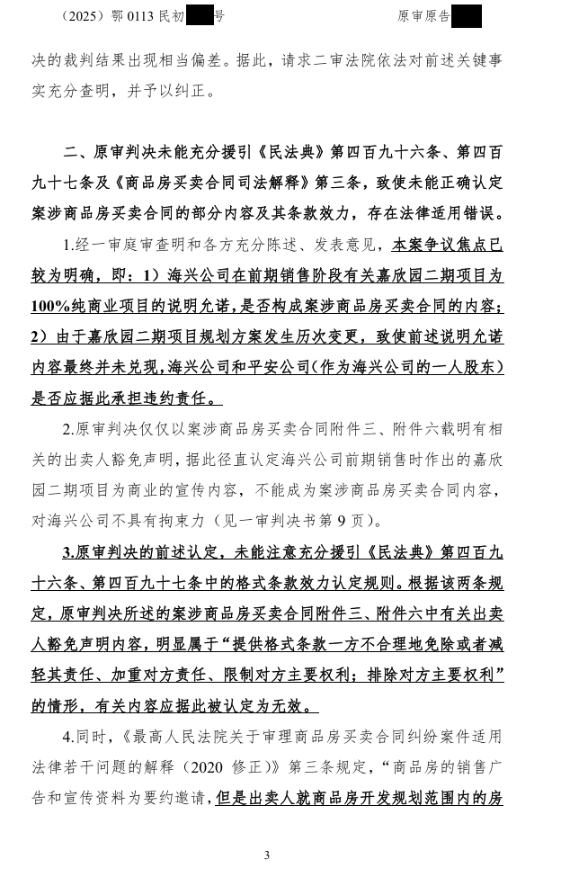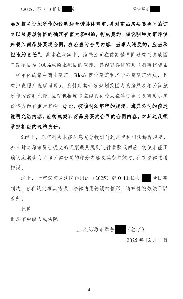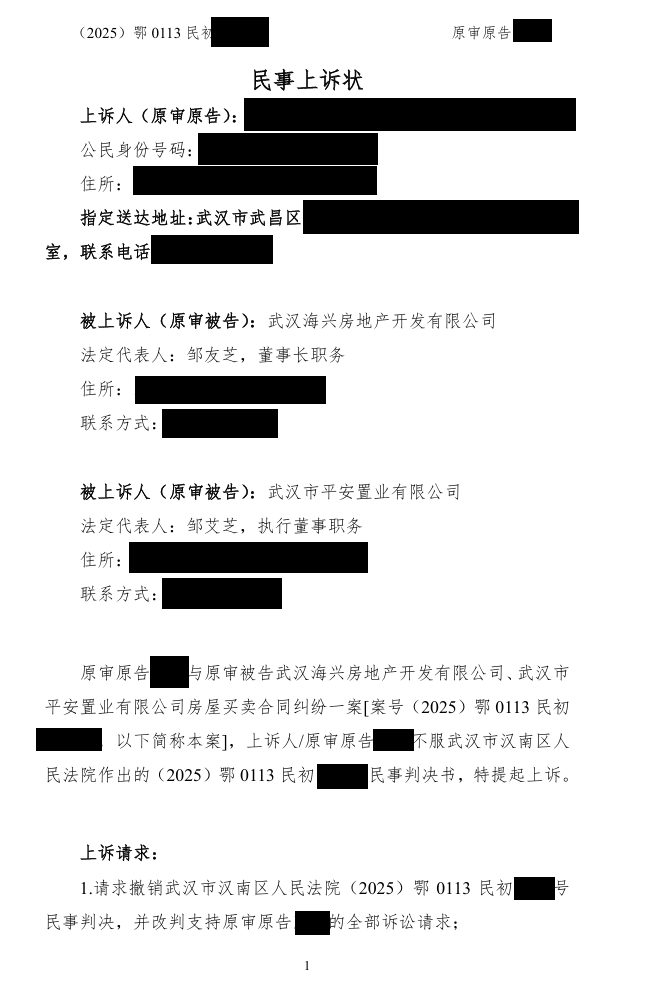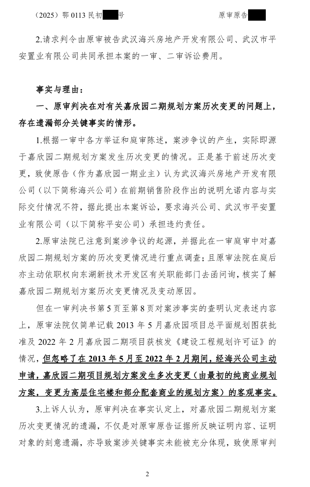 民事诉讼二审诉状 发表于 2025-12-03 分类于 公告 各位亲爱的平安光谷春天(嘉欣园)的业主们:以下是我们集体诉讼二审上诉状: 嘉欣园商改住维权小组 2025年12月03日 重要链接:告嘉欣园全体业主书业主疑问解答众筹款收款情况众筹款使用明细